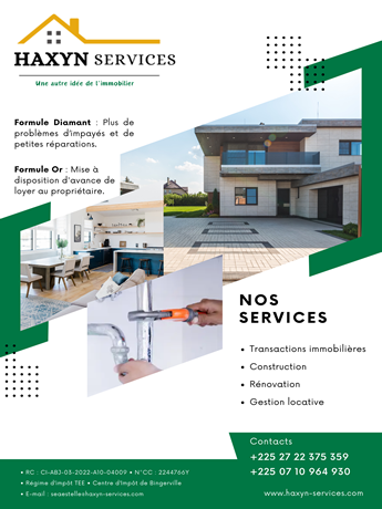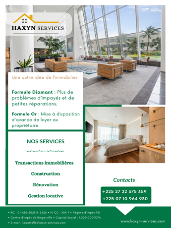 Créé en 2023, HAXYN Services a pour objectif de s’étendre dans les 10 plus grandes villes de la Côte d’Ivoire d’ici 2028 et faire partir des leaders du marché dans l’immobilier en Côte d'Ivoire.
